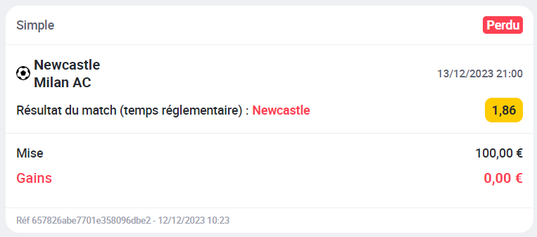 Newcastle – Milan AC (⚽ C1) => Newcastle (1,86 / 1%) ❌