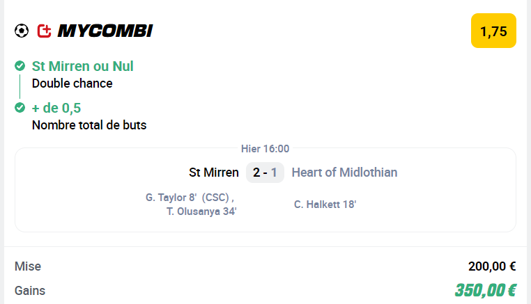 St Mirren – Hearts (⚽ ECO) => St Mirren marque & ne perd pas (1,75) ✅