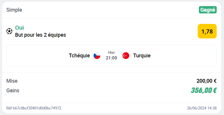Rep. Tchèque – Turquie (⚽ Euro) => BTTS (1,78) ✅