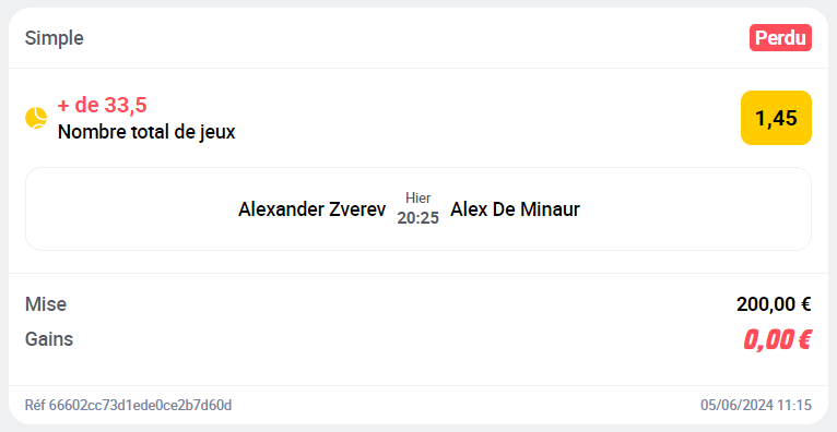 Zverev – De Minaur (🎾 ATP) => +33,5 jeux (1,45) ❌